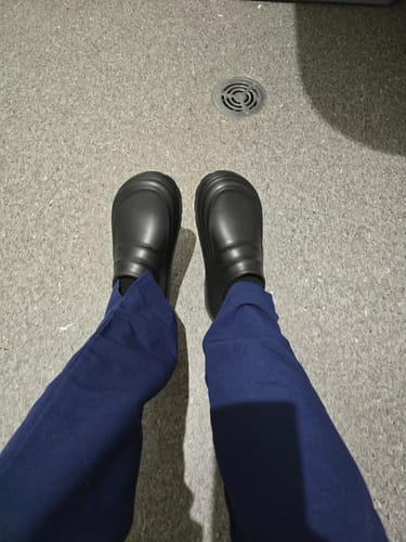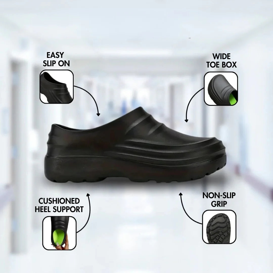 Our rubber traction pods are designed to provide enhanced grip on clean, dry tile and hardwood, and surfaces wet with clean water only. These are everyday comfort shoes, not OSHA-rated safety footwear. If you have balance issues or mobility concerns, please consult your doctor.